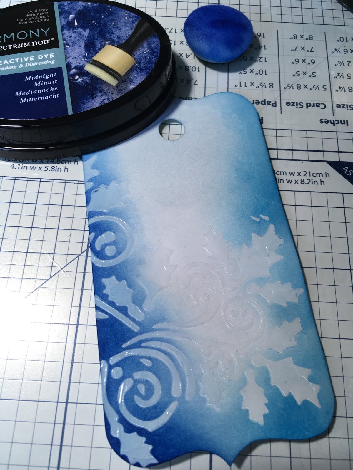De Crafter's Inspiration lag hier weer op de mat en dat is elke keer zo'n genot.... want het tijdschrift is superleuk om door te lezen en alle tutorials die erin staan. Maar je krijgt er ook leuke materialen bij voor sommige van de Tutorials. Deze keer zit er een leuk kerst stencil bij dus daar wilde ik gelijk mee spelen. Dus een tag opgezocht die ik ooit met de Silhouette Cameo heb uitgesneden. Ik heb met de Spectrum noir inktool en de Harmony blauwe tinten eerst de label gekleurd met de lichtste kleur.